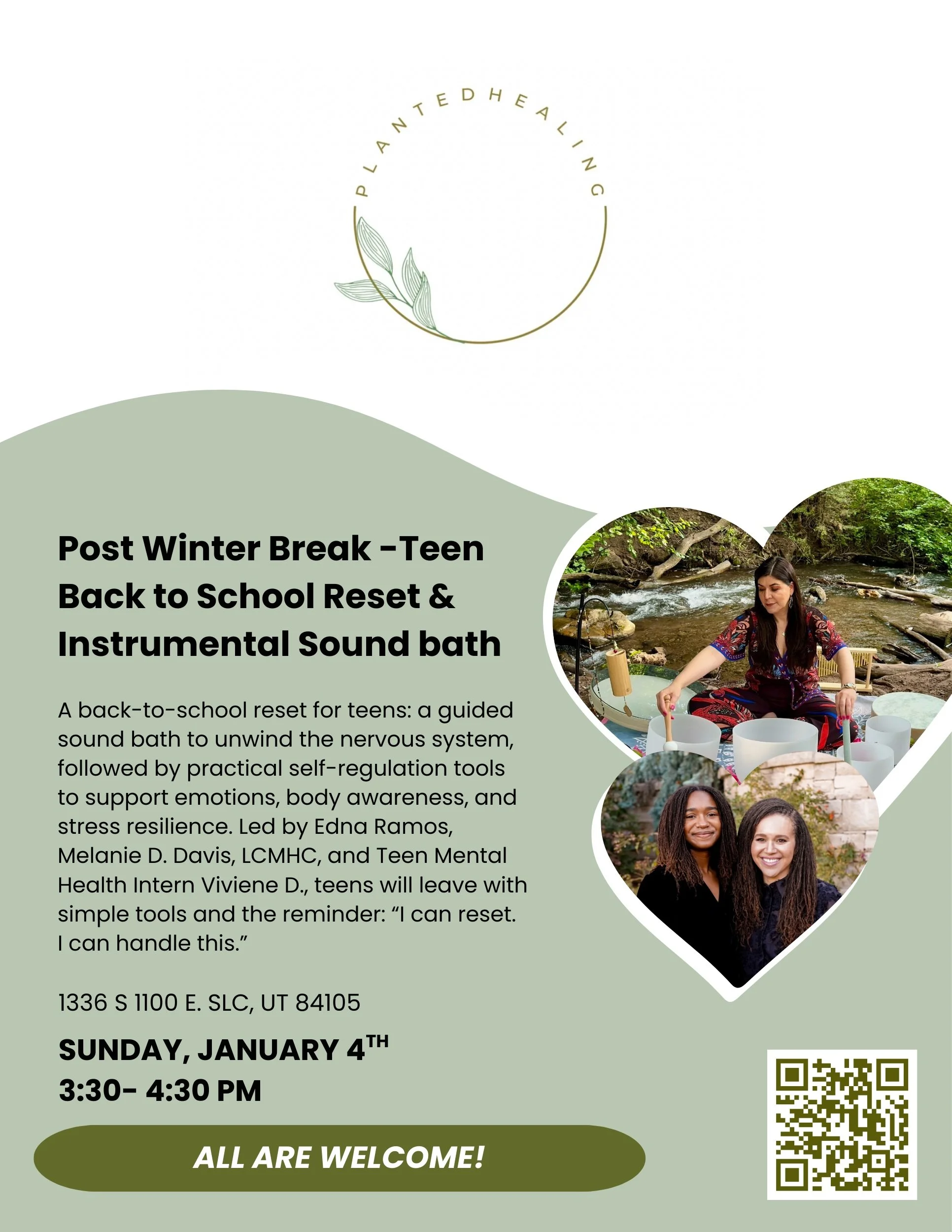 A post Winter Break, back-to-school reset for teens: a guided sound bath to unwind the nervous system, followed by practical self-regulation tools to support emotions, body awareness, and stress resilience.
